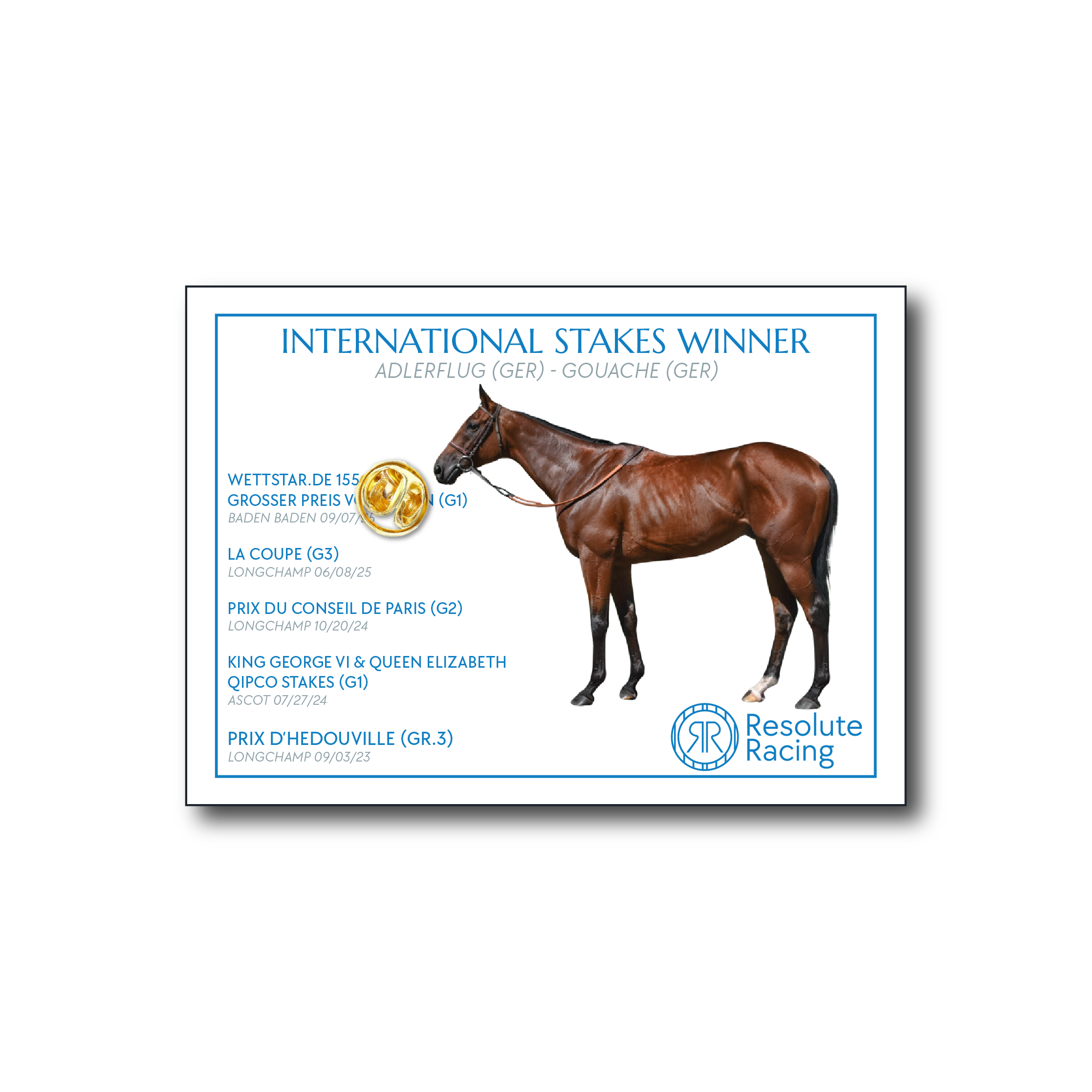 This 1.75-inch hard enamel pin highlights the horse whose résumé spans Royal Ascot, ParisLongchamp, Tokyo, Baden-Baden, and the Breeders’ Cup. His career includes victories in the G1 King George & Queen Elizabeth QIPCO Stakes, the G2 Prix du Conseil de Paris, the G3 La Coupe, and the G1 Grosser Preis von Baden, along with a landmark appearance in the G1 Japan Cup that earned him a global following.